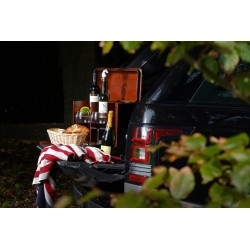 Richiudibile e trasportabile grazie a forti calamite che tengono chiuso il box, può essere utilizzato come box trasportabile oppure come oggetto d'arredamento per esporre bottiglie e bicchieri.