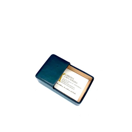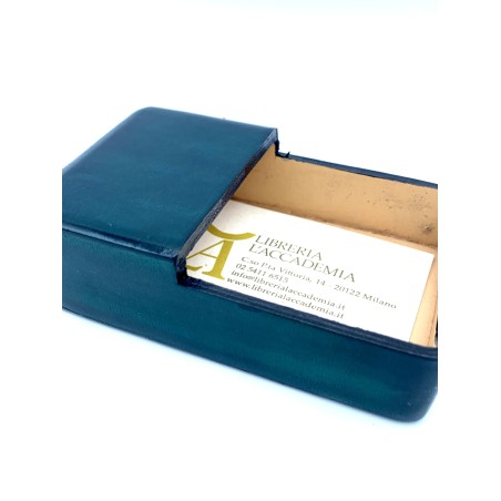 Porta biglietti da visita rettangolare da scrivania, color verde realizzato interamente in cuoio conciato al vegetale, seguendo la tradizione fiorentina, modellando il cuoio bagnato su forma in legno, asciugato, colorato e lucidato a mano, senza nessuna cucitura.
