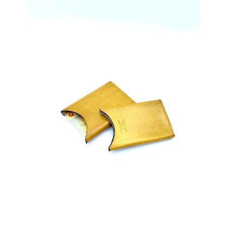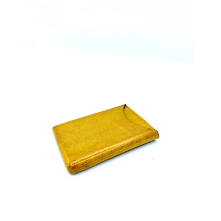 Porta carte di credito, o biglietti da visita, giallo. Interamente in cuoio conciato al vegetale, modellato su forma di legno, senza nessuna cucitura. Colorato e lucidato a mano.