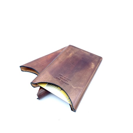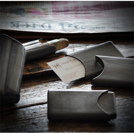 Porta carte di credito, o biglietti da visita, avana. Interamente in cuoio conciato al vegetale, modellato su forma di legno, senza nessuna cucitura. Colorato e lucidato a mano.