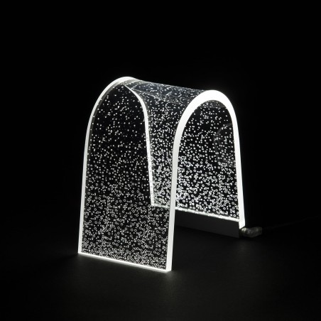 Lampada in cristallo acrilico con decoro effetto bolle inciso a laser. Ha alla base una strip led grazie alla quale il corpo della lampada e le sue incisioni si illuminano creando uno scenografico effetto diffusione.