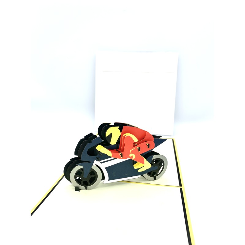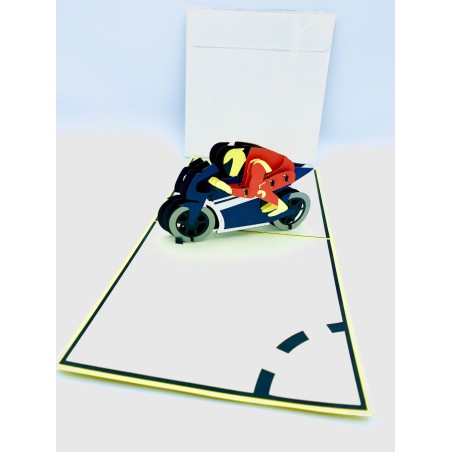 Biglietto d'auguri Kirigami 3D con moto. I biglietti sono confezionati con una sottile plastica e comprendono una busta e un bigliettino dove scrivere.
