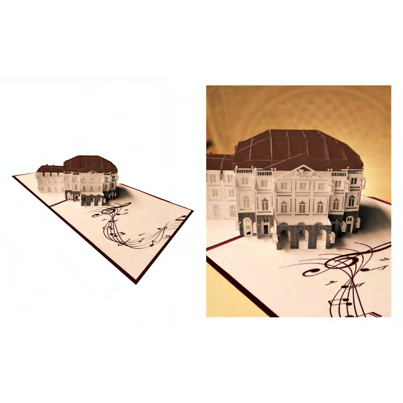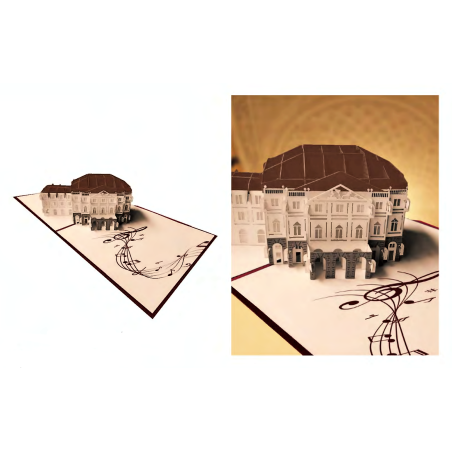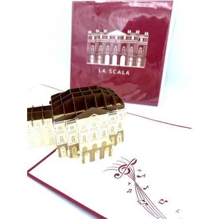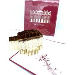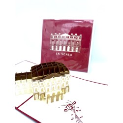 Biglietto d'auguri Kirigami 3D con Teatro alla Scala di Milano. I biglietti sono confezionati con una sottile plastica e comprendono una busta e un bigliettino dove scrivere.
