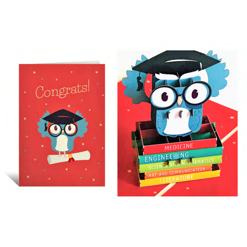 Biglietto d'auguri Kirigami 3D con Gufo perfetto per una Laurea. I biglietti sono confezionati con una sottile plastica e comprendono una busta e un bigliettino dove scrivere.