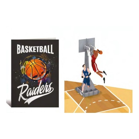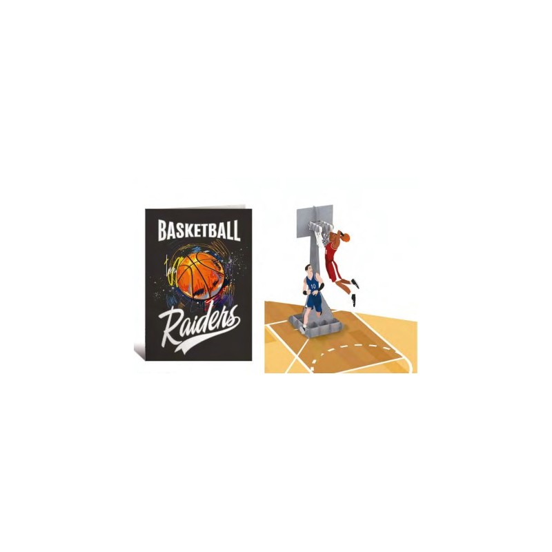 Biglietto d'auguri Kirigami 3D con giocatore di Basket perfetto per gli appassionati di questo sport. I biglietti sono confezionati con una sottile plastica e comprendono una busta e un bigliettino dove scrivere.