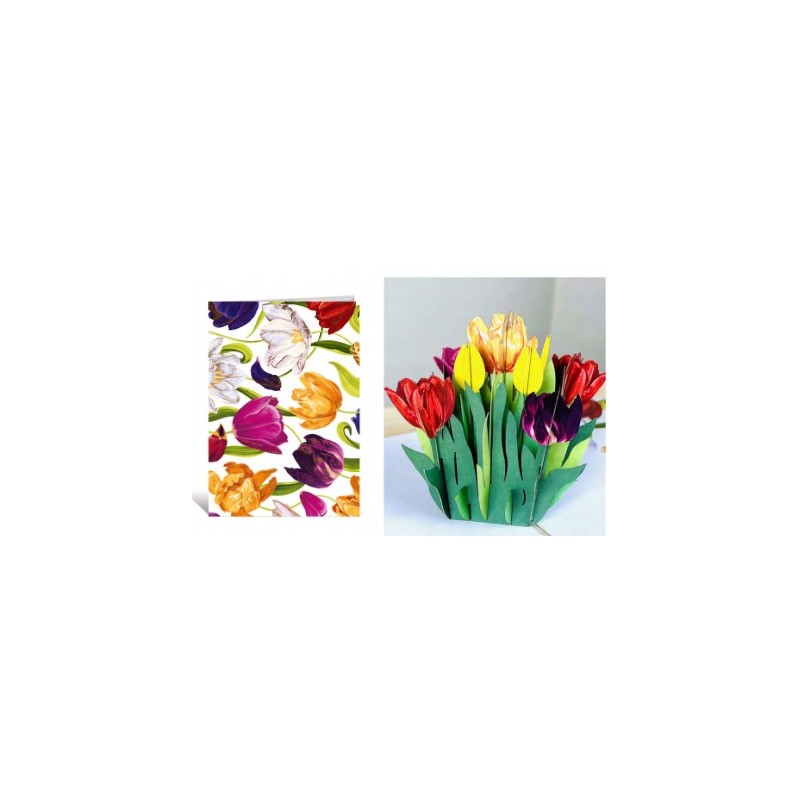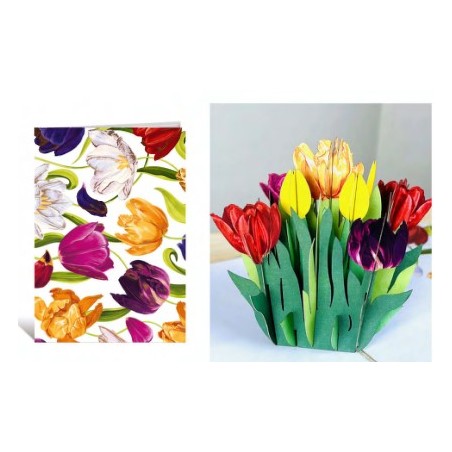 Biglietto d'auguri Kirigami 3D con tulipani. I biglietti sono confezionati con una sottile plastica e comprendono una busta e un bigliettino dove scrivere.