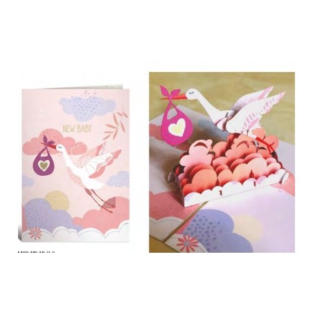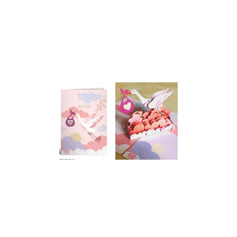 Biglietto d'auguri Kirigami 3D con cicogna rosa. I biglietti sono confezionati con una sottile plastica e comprendono una busta e un bigliettino dove scrivere.