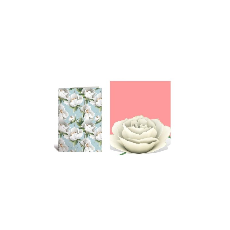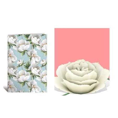 Biglietto d'auguri Kirigami 3D con rosa bianca. I biglietti sono confezionati con una sottile plastica e comprendono una busta e un bigliettino dove scrivere.