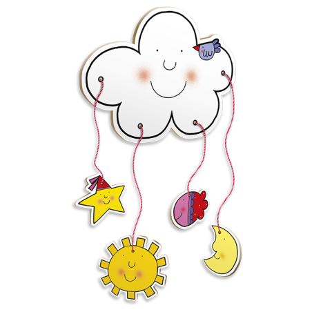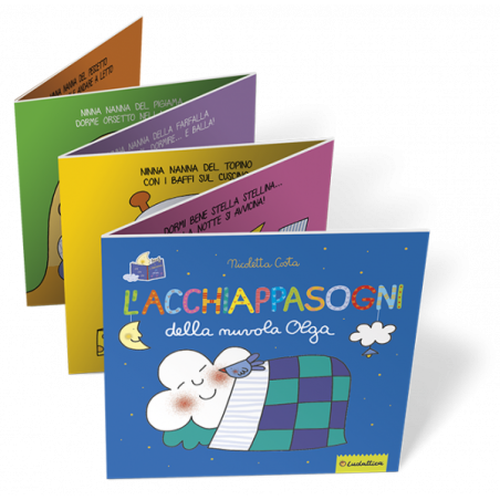 Nella scatola è contenuto un libro a fisarmonica con immagini ad alto contrasto, che presenta tutti i teneri amici della nuvola Olga con dolci filastrocche.