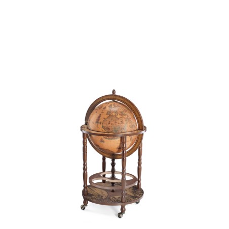 Il mappamondo ha una struttura formata da 4 gambe tornite in legno di faggio che poggiano su apposite ruote per essere facilmente spostato. La base serigrafata a mano raffigura illustrazioni paesaggistiche mentre il ripiano superiore è decorato con figure zodiacali. Gli accessori bar presenti in foto (bottiglie e bicchieri) non sono inclusi.