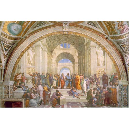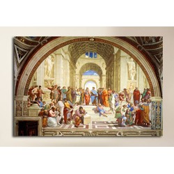 Tela che rappresenta "La Scuola di Atene", affresco di Raffaello Sanzio databile al 1509-1511 esituato nella Stanza della Segnatura, una delle quattro "Stanze Vaticane", poste all'interno dei Palazzi Apostolici.