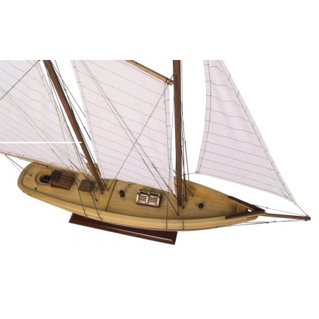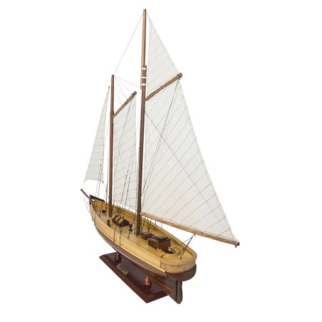 Modellino in legno e tela, con corde fatte a tiranti per reggere e tirare le vele, fedele riproduzione della barca a vela America da cui nasce il nome della America's cup.
