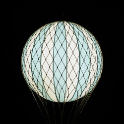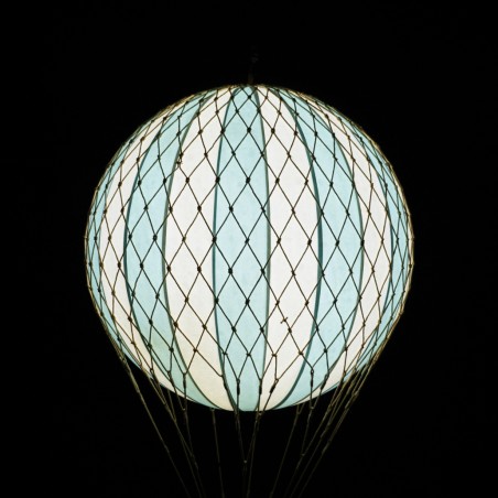 Mongolfiera media a righe azzurre illuminata led, manifattura curata nei minimi dettagli, compresa di filo sintetico trasparente per appenderla ovunque vogliate. Leggera, ma solida al tempo stesso.