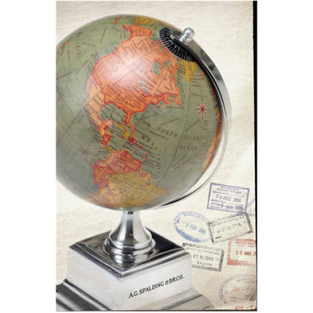 Mappamondo vintage della Spalding & Bros con base in alluminio e globo color vintage verde. Modello dimensione piccola.