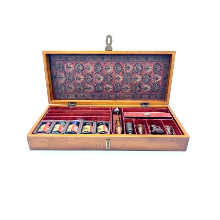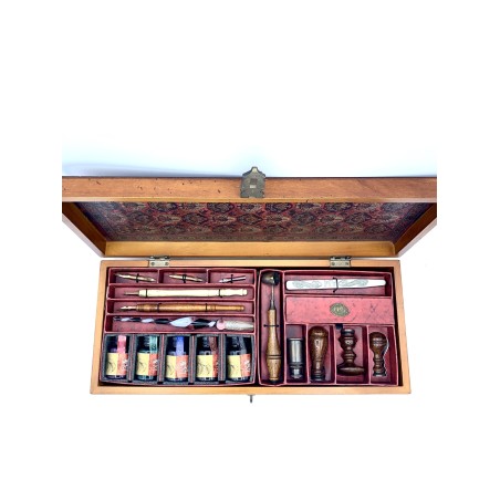 Set da scrittura in legno color miele con penne calligrafiche, ceralacca, inchiostri, Trianon. E' dalle penne che da sempre prende vita l'essenza della parola Cultura, in qualsiasi sua forma. Per questo non può mancare un set da scrittura per coloro che trattano, cercano, aspirano o semplicemente apprezzano il Sapere.