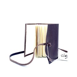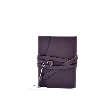 Quaderno taccuino in cuoio marrone certificato dal Consorzio Vera Pelle Conciata al Vegetale in Toscana e lavorato a mano, con ribaltina e laccio in cuoio, misura piccola.