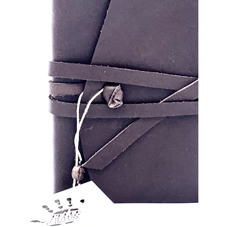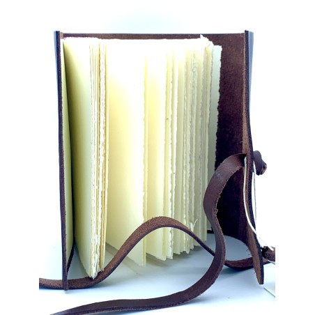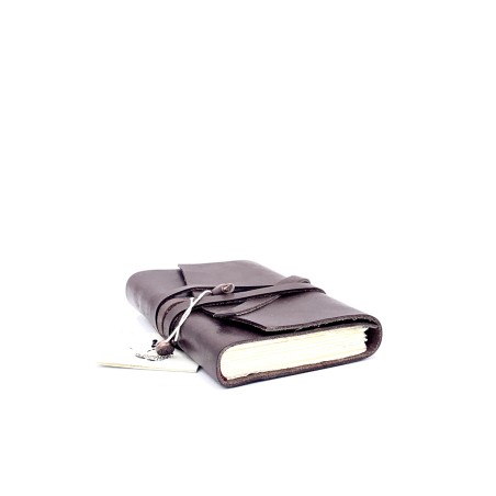 Quaderno taccuino in cuoio marrone certificato dal Consorzio Vera Pelle Conciata al Vegetale. Lavorato e rilegato a mano con carta pregiata tagliata a mano, con ribaltina e laccio in cuoio, misura piccola