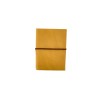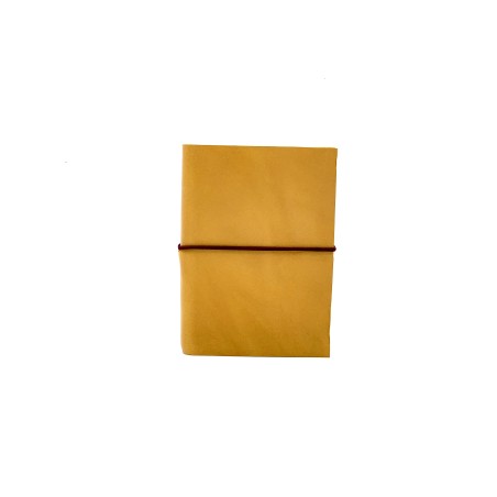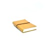 Quaderno taccuino in cuoio giallo certificato dal Consorzio Vera Pelle Conciata al Vegetale. Lavorato e rilegato a mano, chiuso da un pratico elastico colorato, misura piccola