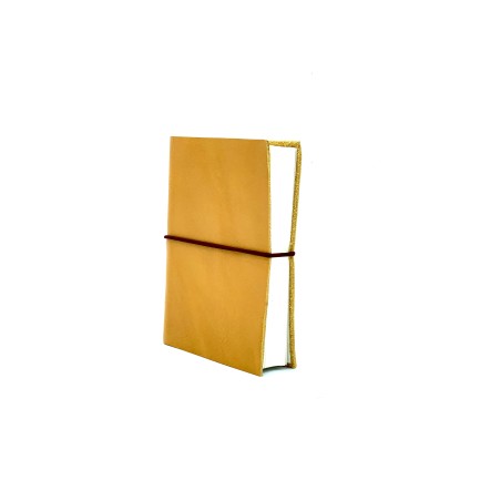 Quaderno taccuino in cuoio giallo certificato dal Consorzio Vera Pelle Conciata al Vegetale in Toscana e lavorato a mano, con pratico e colorato elastico, misura piccola.