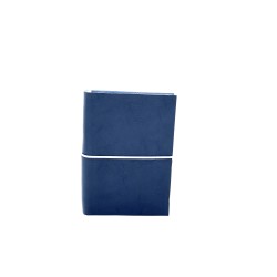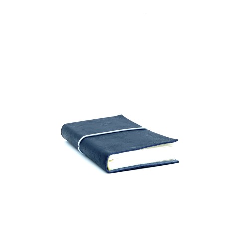 Quaderno taccuino in cuoio blu certificato dal Consorzio Vera Pelle Conciata al Vegetale in Toscana e lavorato a mano, con pratico e colorato elastico, misura piccola.