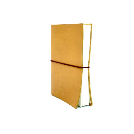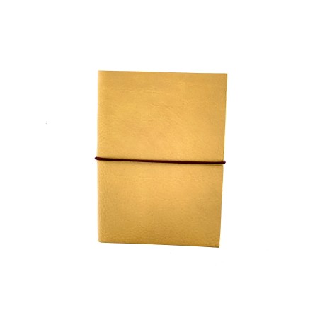 Quaderno taccuino in cuoio giallo certificato dal Consorzio Vera Pelle Conciata al Vegetale in Toscana e lavorato a mano, con pratico e colorato elastico, misura media.