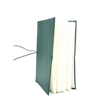 Quaderno taccuino in cuoio verde certificato dal Consorzio Vera Pelle Conciata al Vegetale. Lavorato e rilegato a mano, chiuso da un pratico elastico colorato, misura grande