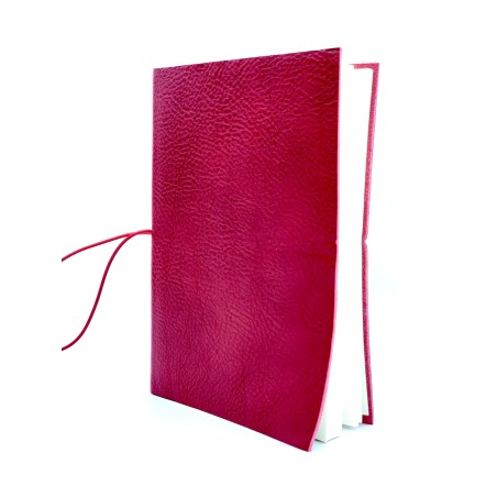 Quaderno taccuino in cuoio rosso certificato dal Consorzio Vera Pelle Conciata al Vegetale. Lavorato e rilegato a mano, chiuso da un pratico elastico colorato, misura grande
