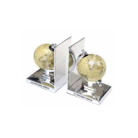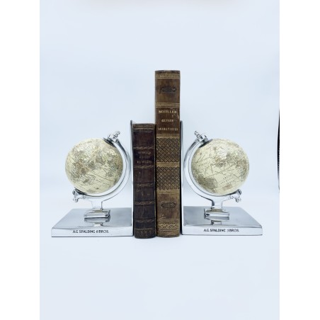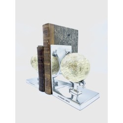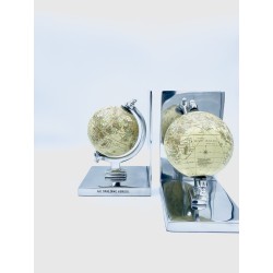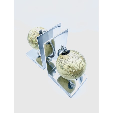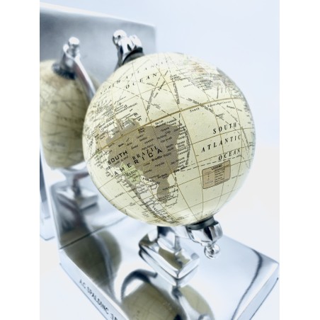 Reggilibri a coppia in alluminio e mappamondo vintage con mappa chiara. Il mappamondo ruota come un normale globo da consultazione.