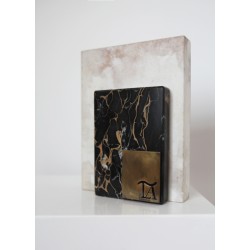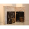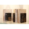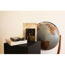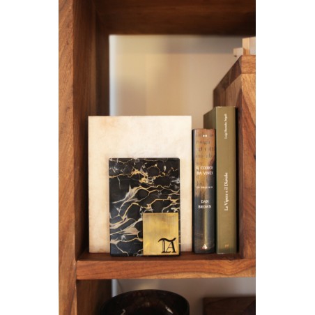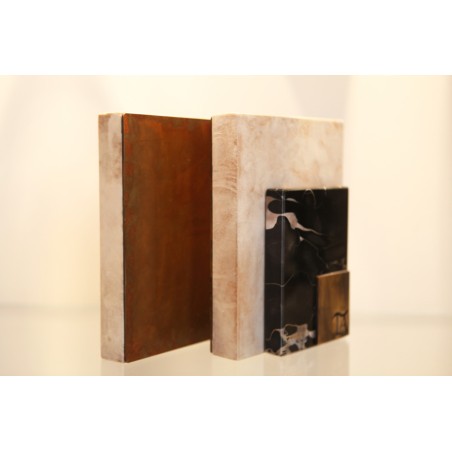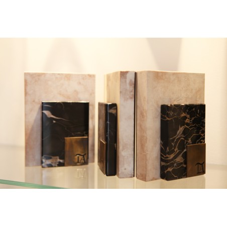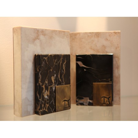 Un prodotto firmato LA, Libreria L'Accademia. Coppia di reggilibri poliedrico da utilizzare in differenti posizioni. Un reggilibro di materiali preziosi e dal design unico, frutto di uno studio artistico di interior designer. Fatto di marmo di Portoro lucidato, pelle pergamena anticata, lastra di ferro ossidato e placca di ottone brunito.