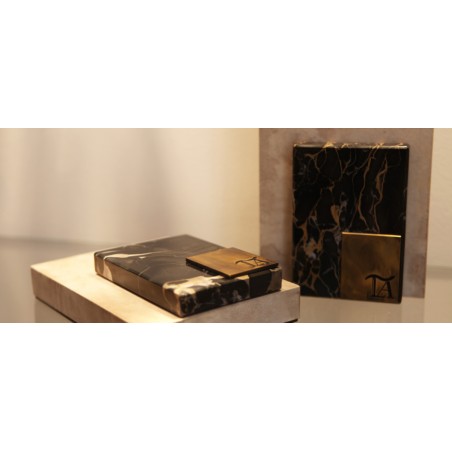 Abbiamo selezionato i materiali dopo infiniti accostamenti e riflessioni sulla continuità di forme, luci e armonia che i materiali restituivano al tatto. Li abbiamo quindi sovrapposti l’uno all’altro per esprimere la perfezione che stavamo cercando: Il marmo di Portoro lucidato, la pelle pergamena anticata, una lastra di ferro ossidato ed una placca di ottone brunito e inciso con il logo “LA”.
