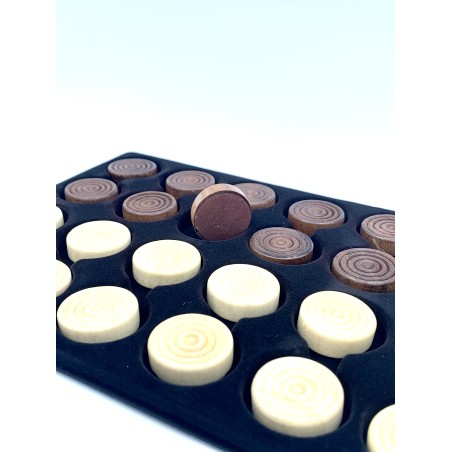 Set con pedine da dama chiare e scure in legno. Da acquistare assieme ad una delle nostre scacchiere disponibili sul sito, oppure da acquistare singolarmente per utilizzarle con la propria scacchiera. Semplici e ben definite.