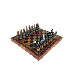 Scacchiera in similpelle e cuoio, ornamentale, con contenitore. La parte superiore è ribaltabile per giocare a backgammon ed il contenitore ospita anche le pedine da dama. Rifinita a mano, decorata e curata nei dettagli. Questo set scacchiera comprende anche gli scacchi di Napoleone, di perfetta pesatura e dimensioni, in metallo. Anche le pedine degli scacchi sono stampate e rifinite a mano e curate nei dettagli.