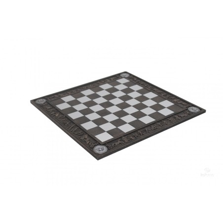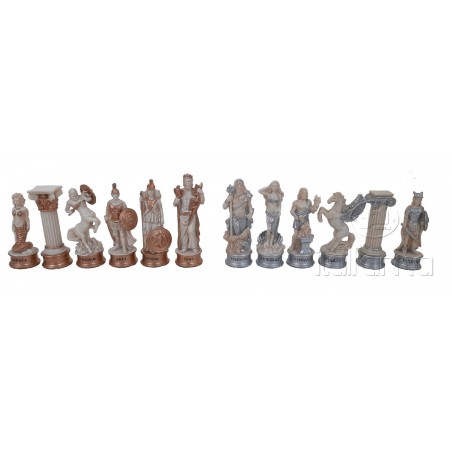 Scacchiera in resina, con intarsi che richiamano i motivi"mitologici" ai lati della scacchiera stessa. Un prodotto unico, rifinito a mano e impreziosito dalle pedine mitologiche greche che rappresentano gli dei, con tanto di nome su ogni pedina. Gli scacchi sono in resina, dipinti e rifiniti a mano, curati in ogni dettaglio: dalle colonne greche ai nomi dei singoli Dei raffigurati.