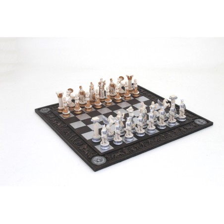 Scacchiera in resina, con intarsi "mitologici" ai lati. Un set da scacchi compreso di pedine appartenenti alla mitologia greca, una battaglia tra dei dell'Olimpo per rivivere nel passato