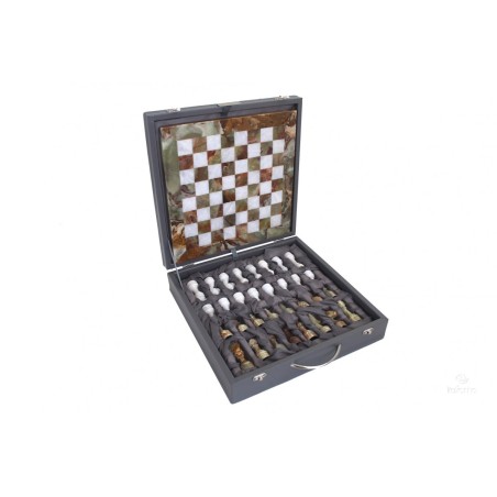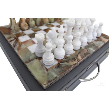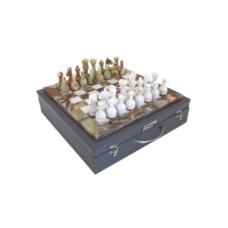 Un set scacchiera in onice e marmo, di pregiata fattura. Liscio e solido, il marmo su cui poggiano le pedine è davvero stupendo al tatto. Ad impreziosire il set una valigia in ecopelle perfetta per riporre le pedine e la scacchiera durante il trasporto. Una valigia che si può esporre assieme alla scacchiera se si decide di utilizzare il set come oggetto d'arredamento.
