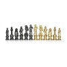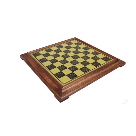 Scacchiera in legno con top effetto ottone colore ottone ed intarsi decorativi color nero. Il set da scacchi è impreziosito dalla presenza di scacchi "storici" dipinti e rifiniti a mano.