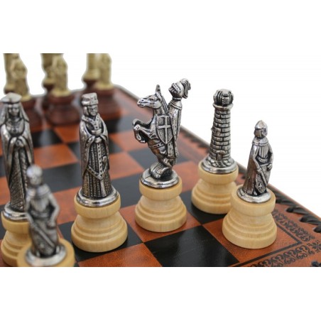 Scacchiera in similpelle con contenitore. Set impreziosito dalla presenza di scacchi in metallo stampati e rifiniti a mano, in stile Medioevale.