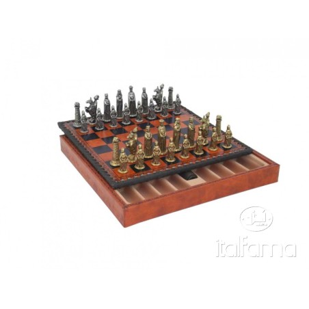 Scacchiera in similpelle con contenitore per backgammon e pedine da dama. Il set da scacchi è impreziosito dalla presenza di scacchi "storici" in stile Medioevale dipinti e rifiniti a mano.