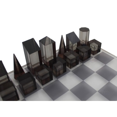 Set scacchiera in plexiglass grigio e trasparente con scacchi in stile cubitale.