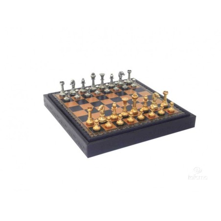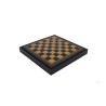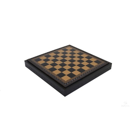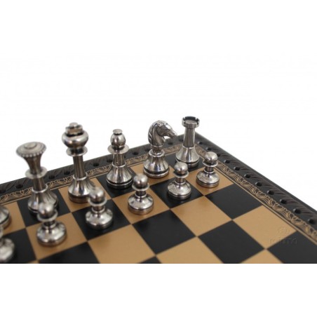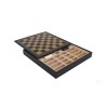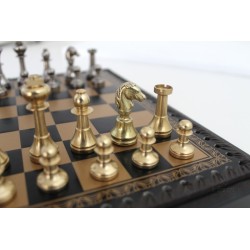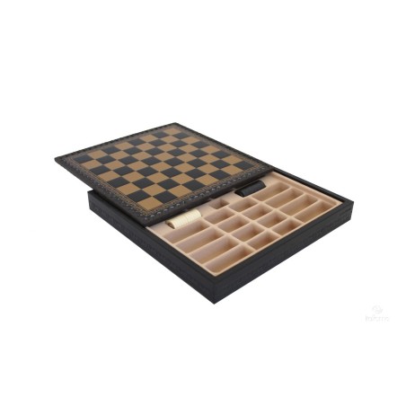 Scacchiera in similcuoio nei colori nero ed oro con contenitore e pedine da dama. Il set da scacchi è impreziosito dalla presenza di scacchi "Mignon" in ottone tornito e sainato a mano.