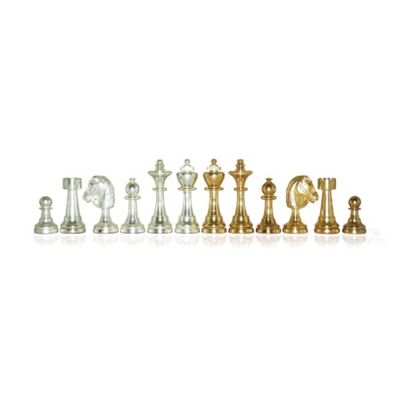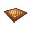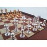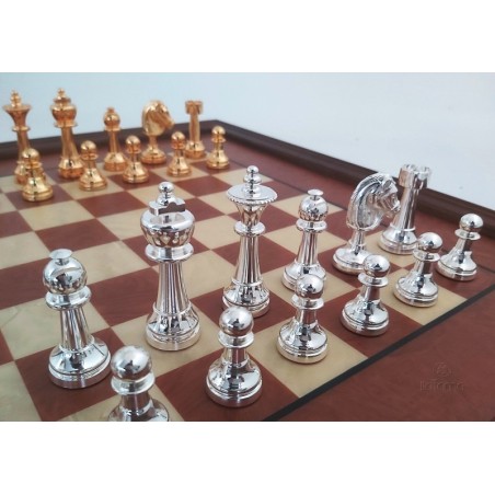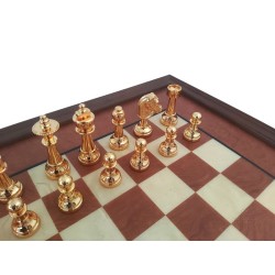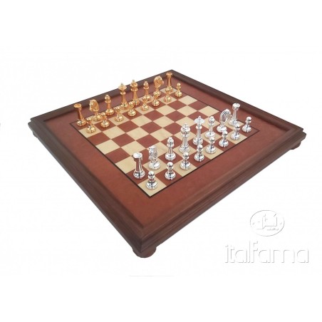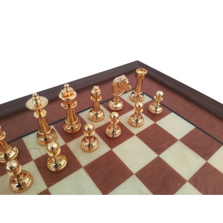Scacchiera in radica di madrona intarsiata a mano con cornice in legno. Il set è completo di scacchi modello Staunton in ottone dorato e argentato tornito e satinato a mano.