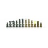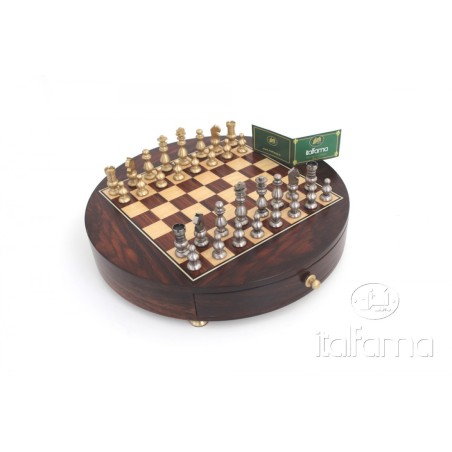 Set scacchiera in palissandro dorato dalla finitura lucida intarsiata a mano con cassetto e scacchi in stile Francese piccolo in ottone dorato e argentato tornito e satinato a mano.