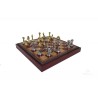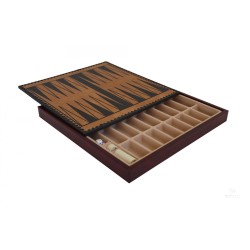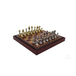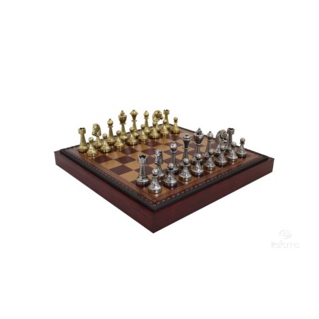 Scacchiera in similpelle con contenitore per backgammon e pedine dama. Scacchi in metallo modello Staunton.