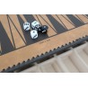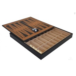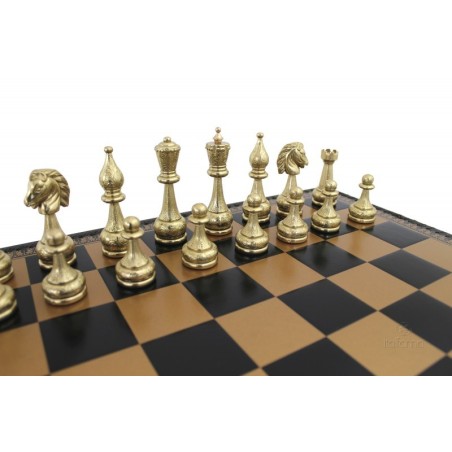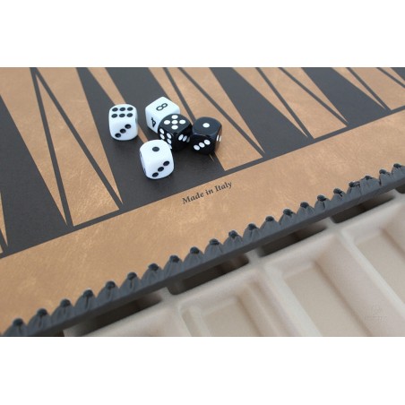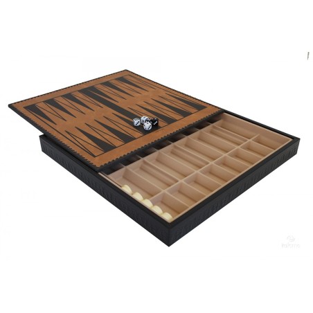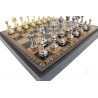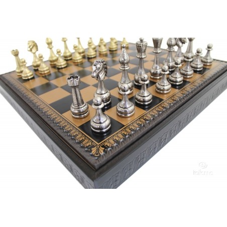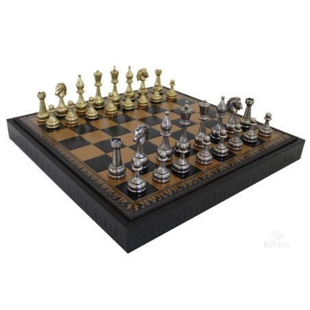 Scacchiera in similpelle arricchita di contenitore per backgammon e pedine dama. Scacchi in metallo modello Fiorito.