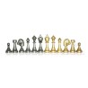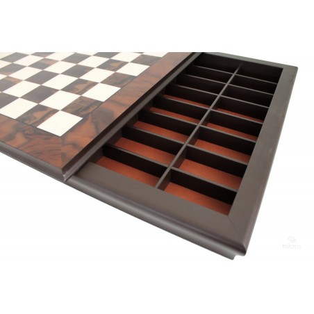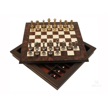 Scacchiera in radica di legno noce e acero con contenitore e scacchi in metallo modello Staunton.