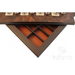 Scacchiera in radica di legno con contenitore e scacchi in metallo modello Staunton.