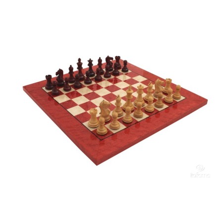 Set scacchiera in radica di Erable rossa intarsiata a mano e scacchi in gemma di palissandro, doppio piombo, feltro in velluto nero e rifiniti a mano.
