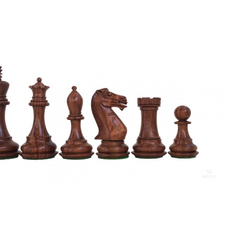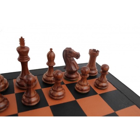 Set scacchiera in vera pelle lavorata a mano con cassetto contenitore per gli scacchi e scacchi in legno di palissandro modello Staunton Elegance con doppio piombo, feltrati e rifiniti a mano.