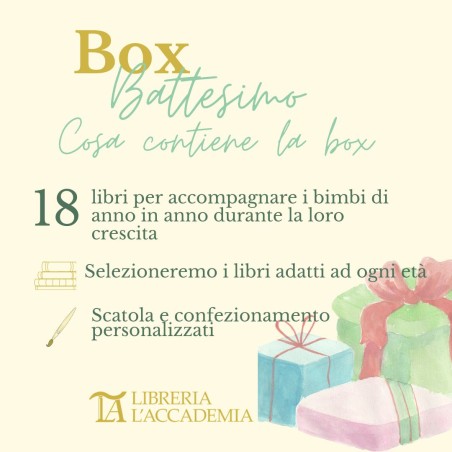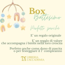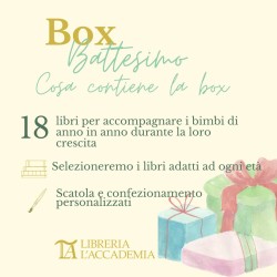 La nostra Box Battesimo è un’ idea regalo originale, dedicata nello specifico al bambino che viene battezzato, ma che è molto adatta anche come dono di nascita o per il primo compleanno. E’ “un libro per ogni anno”: significa accompagnare anno dopo anno, il bambino nella sua crescita. E’ un regalo intriso di valore culturale e simbolico. Per il battezzando o per il bambino che sta per soffiare la sua prima candelina, una delle proposte è quella di scegliere un titolo per ogni anno che verrà, fino al compimento dei suoi 18 anni. Il libro, quindi, rimarrà come ricordo e dono futuro, segno e simbolo di infinito affetto. Potrà essere scartato all’anniversario di battesimo di anno in anno, oppure nel giorno stesso del suo compleanno fino al suo diciottesimo.