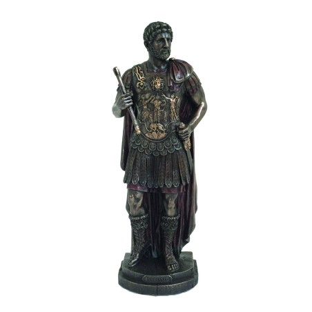Statua di Adriano imperatore in resina bronzata, rifinita a mano in ogni minimo dettaglio. La nostra selezione di statue è iniziata nel 1998, da sempre pensiamo che questo oggetto culturale nasconda una magia che agisce anche sullo stato d'animo. Adriano (76-138 a.C.) fu imperatore romano dal 117 al 138. Nato da famiglia ispano-italiana, è conosciuto in tutto il mondo nella storia per la costruzione del Vallo di Adriano che segnò il limite della Britannia settentrionale, la ricostruzione del Pantheon e la costruzione del Tempio di Venere a Roma. È anche un famoso rappresentante dell'umanesimo.